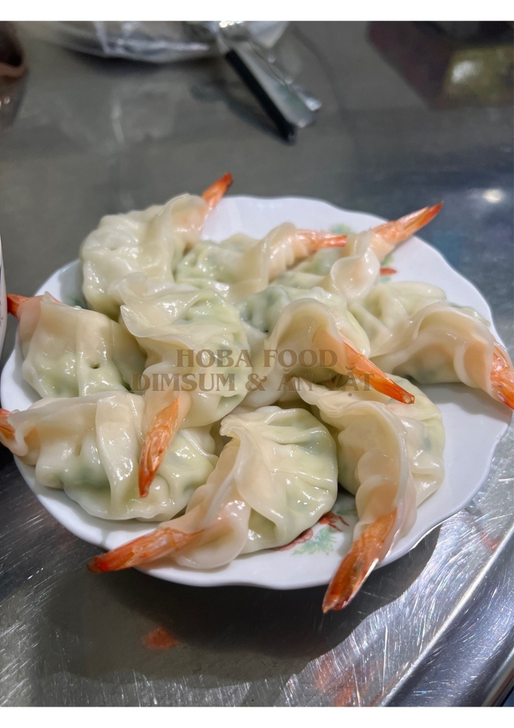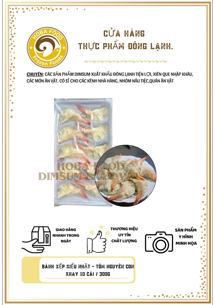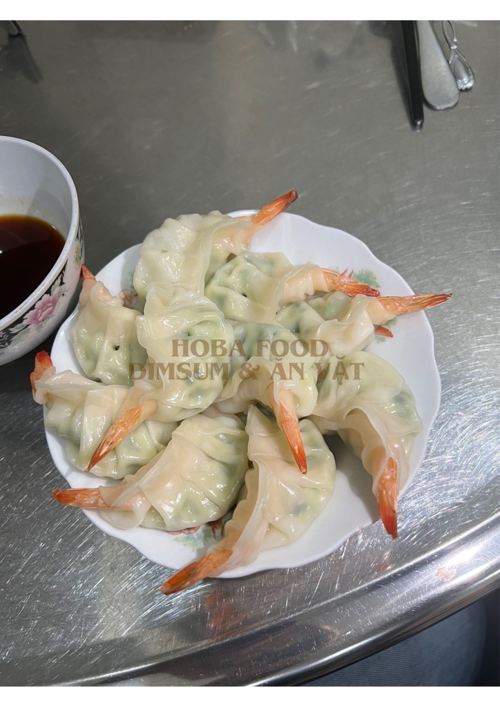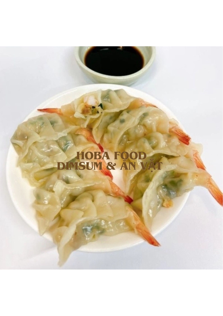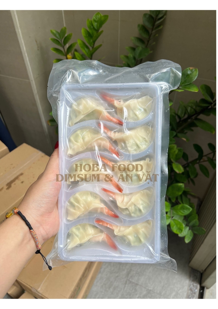 - Bánh xếp có lớp vỏ bột màu trắng ngà bên ngoài được định hình theo hình dáng truyền thống của bánh Gyoza Nhật Bản bọc dọc theo tôm nguyên con